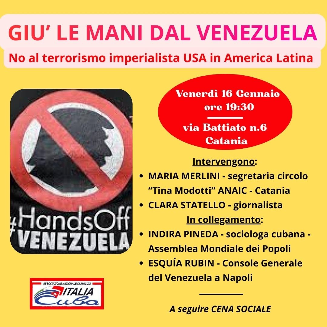 intervengono: Maria Merlini (segretaria circolo "Tina Modotti" ANAIC - Catania), Clara Statello (giornalista). In collegamento: Indira Pineda (sociologa cubana - Assemblea Mondiale dei Popoli), Esquía Rubin (Console Generale del Venezuela a Napoli).