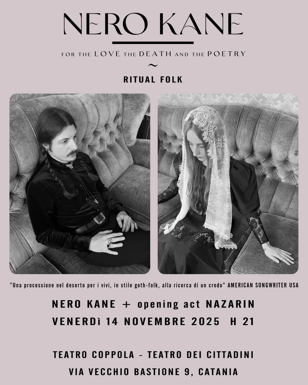Il songwriter, cantante e chitarrista Nero Kane, accompagnato al mellotron e alla voce della storica collaboratrice e poliedrica artista avant-garde Samantha Stella, ha costruito negli anni uno stile unico e personale: catartico, desertico, pastorale, ritualistico e psichedelico. Con uno sguardo aperto al blues e alla canzone d'autore classica, la sua musica è particolarmente incentrata su temi quali morte, religione e amore.